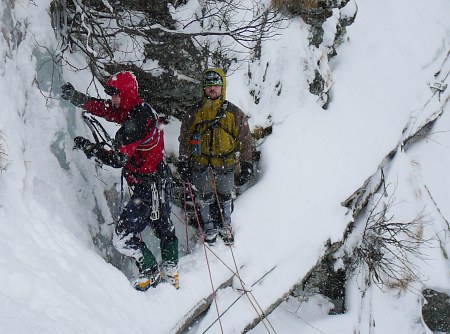 Rechter Doppellutscher (4) Dalo by se říct, že je nečas. Sněží a život nám zpestřují prachové lavinky. Martin mi navíc hodí za krk kus ledu, až se mi zatmí před očima. Martin se ve svém sólu zastavil a medituje. Cestou mi docházejí expresky, takže mi Martin jednu posílá a druhé jištění dělá z lana. Mám toho tak akorát. Sestup je v pohodě, jednu délku slaňujeme. Po večeři, kterou Bruno vrhá zpět, jdem na prohlídku města a vodopádu. A nakonec na pivo.