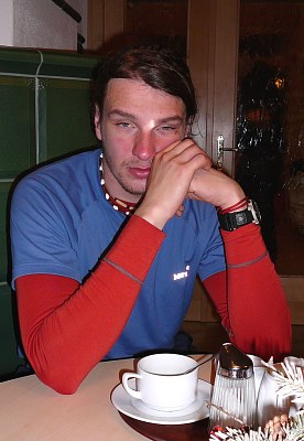 narozeninový večírek Sobota ráno. Chlapcům se vstává těžce. Obzvlášť Burno vypadá na umření. Zpočátku to přikládáme kocovině, ale jak jde čas, asi v tom bude i něco jiného. Včerejší azuro je to tam, sněží. Vyrážíme, jak tušíte, ne moc brzo. Vybíráme si nálevku - Federweiss Fall (4). Plán je, že polezu první délku, doleze Martin, hodíme Brunovi lano na fix a Marťas bude pokračovat nahoru.