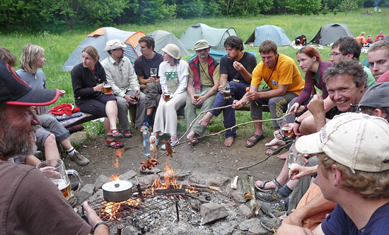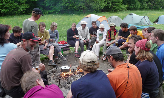 Letošní Rabštejn se myslím opravdu povedl. Počasí na jedničku, lidí kupa, prostě tak jak to má být. Karvinský oddíl tu měl lezecký závod dvojic, kterého jsme se měli také účastnit. Ale popořadě. Příjezd v pátek večer, novinky v podobě jiného místa na spaní, mírné úplaty za spaní, pivko, oheň, párky, pohoda. Ráno nás vítá sluníčko, snídáme kulturně u stolu. Do toho si rozšiřujeme znalosti v rámci odborné diskuse o konstrukci a složení destilační kolony pro zpracování ovoce a ropy.