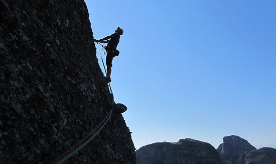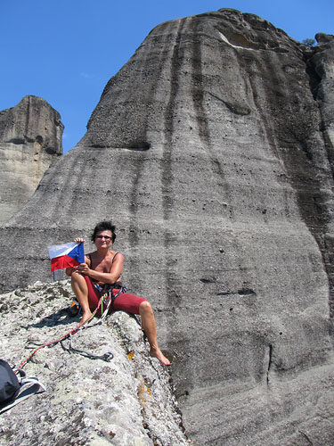 Meteora 2012Zdeňička, IvanRok utekl jak voda a je zase léto a s tím spojené lezení v námi oblíbené Meteoře. Letos jsme nejeli tradičně autem, ale v pondělí 27.8. jsme odletěli do Soluně. Po vyzvednutí zavazadel jsme se místní dopravou č. 78 za 80 centů bez problémů přesunuli na vlakové nádraží a za 15 E přímým vlakem přijeli za tři a půl hodiny do Kalampaky (Meteory). Pak už jen třicet minut pěšky do kempu v Kastraki. Tady jsme se usadili na osm dní a podnikali výstupy na různé věže. První den jsme podnikli výstup tří délkovou cestou na Heiliggeistwachter Schmale Wand za V. Pěkné vyrovnané dobře odjištěné lezení , doporučuji.